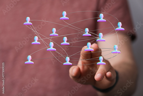 Concept of digital networking, connection, and human interaction. A hand touches a network of connected human figures, representing teamwork and