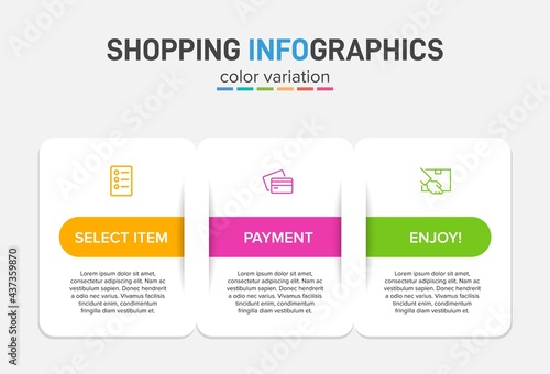 Concept of shopping process with 3 successive steps. Three colorful graphic elements. Timeline design for brochure, presentation, web site. Infographic design layout.