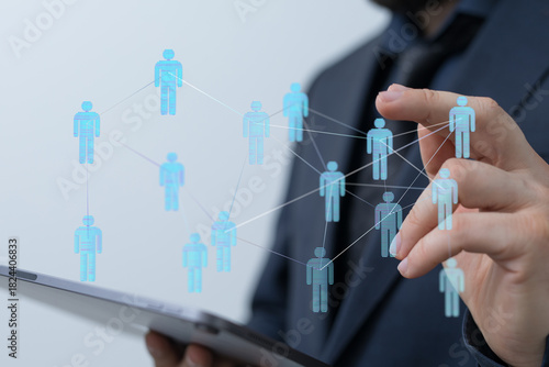 Concept of teamwork, connection, and social networking with digital icons. Businessman using a tablet to connec