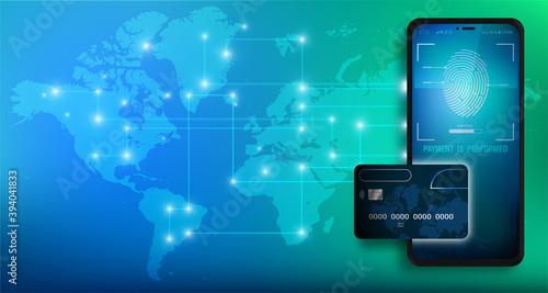Concept. Secure payments online with smartphone in online store. Internet payment via mobile phone by credit card. Bank card data scanning. Fingerprint identification. Vector