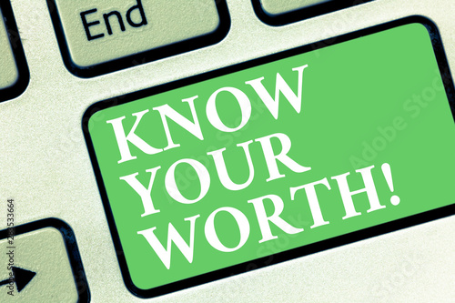 Conceptual hand writing showing Know Your Worth. Business photo showcasing Be aware of demonstratingal value Deserved income salary benefits Keyboard key Intention to create computer message idea