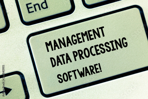 Conceptual hand writing showing Management Data Processing Software. Business photo showcasing System technological applications Keyboard key Intention to create computer message idea