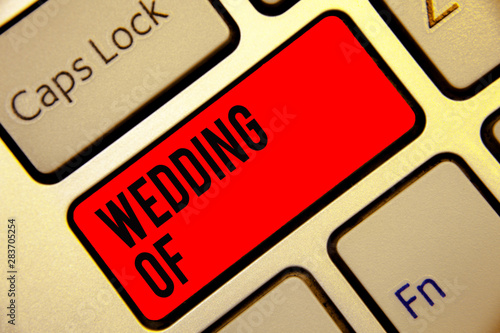 Conceptual hand writing showing Wedding Of. Business photo text announcing that man and woman now as married couple forever Keyboard red key create computer computing reflection document