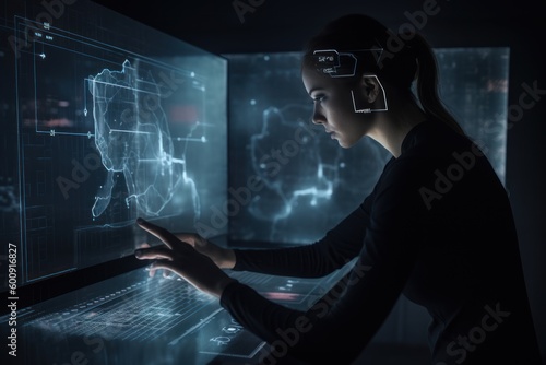 Conceptual image depicting a person utilizing augmented reality to collaborate with an AI system, showcasing the dynamic interaction between human and machine. Created with generative A.I. technology.