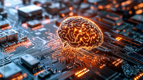 conceptual image of artificial intelligence featuring glowing brain on circuit board, symbolizing fusion of technology and human intellect