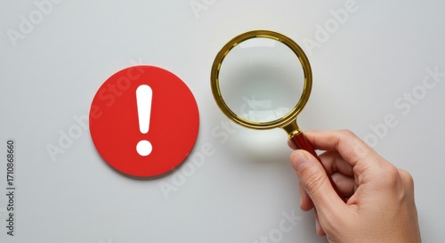 Conceptual representation of a magnifying glass examining an exclamation mark on a neutral background, symbolizing investigation and alert