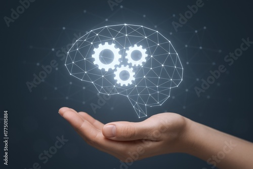 Conceptual Visualization of Artificial Intelligence and Human Brain Functionality with Gears Supported by Hand