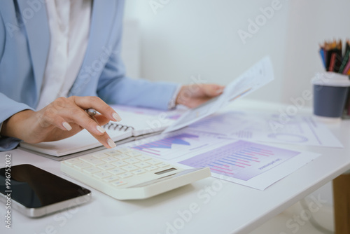 Confident Asian businesswoman in modern office smiling while working on laptop, analyzing reports, planning marketing strategies and leading with energy and positivity.