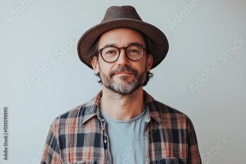 Confident Man with Glasses and Hat Posing Against a Neutral Background
