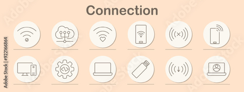 Connection set icon. Globe, Wi-Fi, video, location, lock, cloud, broadcast, monitor, profile, network, wireless, internet, connection, digital, online, communication, security, icon, remote, signal