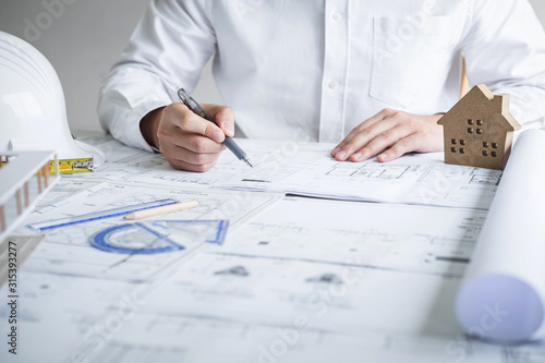 Construction engineering or architect hands working on blueprint inspection in workplace, while checking information drawing and sketching for architecture project working