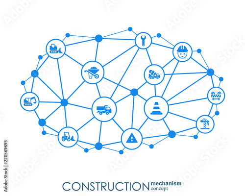 Construction network. Hexagon abstract background with lines, polygons, and integrated flat icons. Connected symbols for build, industry, architectural, engineering concepts. Vector.