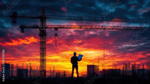 Construction worker at sunset with cranes.