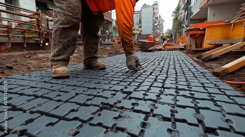 Construction Worker Examining Interlocking Plastic Pavement Tiles