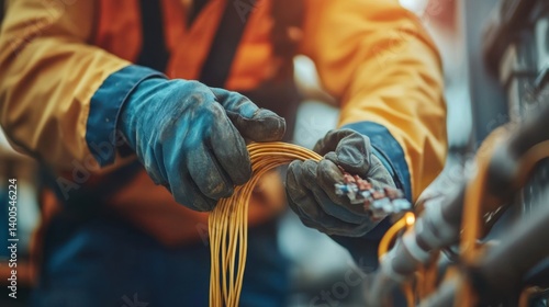 Construction worker installing electrical wires into a conduit. Featuring precision and focus