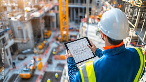 Construction worker reviews blueprints on tablet