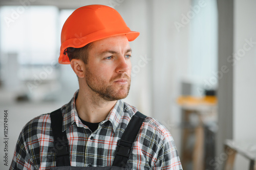 Construction worker wearing hardhat inspecting building under construction