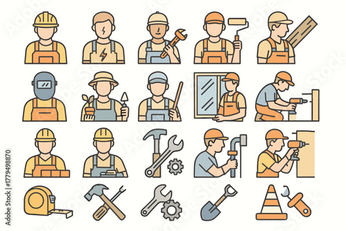 Construction Workers and Tools Icons – Builder Occupations Vector Set