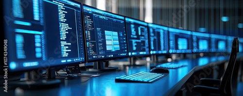 Control room with multiple monitors displaying data in a dark environment