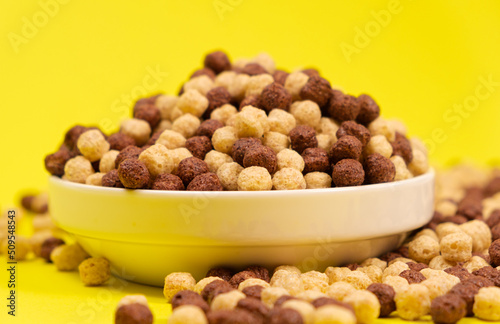 Corn sweet balls on a yellow background. Quick dry breakfasts, side view.