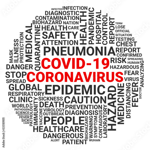 Coronavirus COVID-19. Word cloud arranged in a circle.
