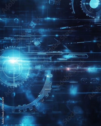 Corporate technology banner showcasing innovation themes with gears, icons, and dynamic light effects