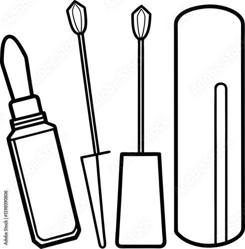 Cosmetic Outline Set Eyeliner, Mascara, and Lip Gloss Line Art on White Background