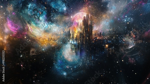Cosmic Cityscape: A Futuristic Vision of Urban Life Among the Stars - A vibrant city, bathed in the glow of stars and nebulas, suggests a future where humanity has embraced the cosmos, symbolizing spa