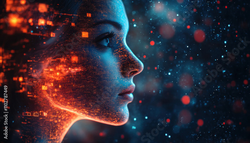 Cosmic code vulnerability, high frequency, digital face, technology, data visualization, futuristic, abstract art, profile, glowing elements, cybernetic