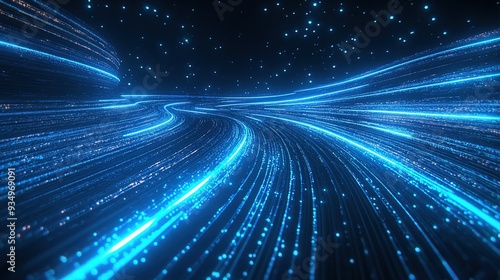 Cosmic Data Stream: A mesmerizing flow of vibrant blue light streaks through the depths of space, depicting the rapid transmission of information in the digital age.