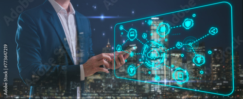 could computing Digital transformation concept. System engineering Binary code Programming businessman using smartphone working with virtual could computing ai technology diagram