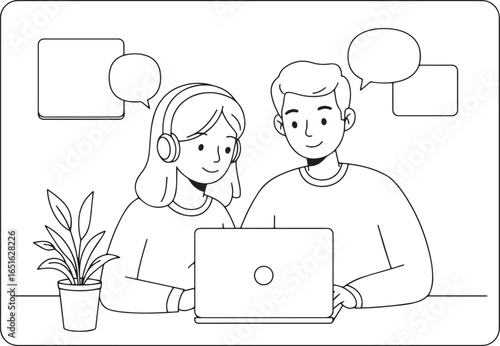 Couple collaborating online with laptop, using headsets in moder