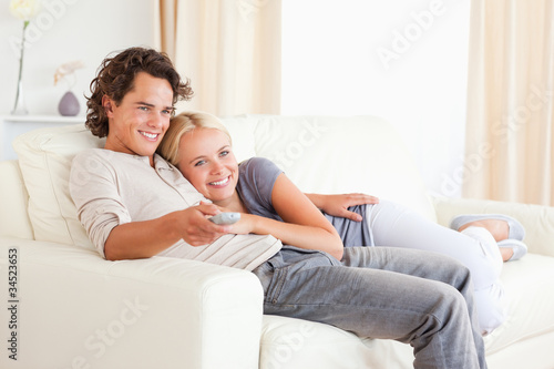 Couple cuddling while watching TV
