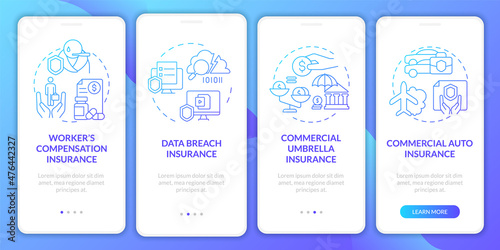 Coverage types blue gradient onboarding mobile app screen. Assurance walkthrough 4 steps graphic instructions pages with linear concepts. UI, UX, GUI template. Myriad Pro-Bold, Regular fonts used