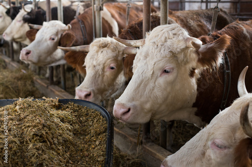 Cows eating in stable