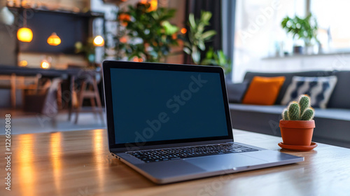Cozy living room workspace with laptop with blank screen and cactus. Modern home office setup. Concept of remote work, comfortable office environment, home decor. Mockup. Copy space