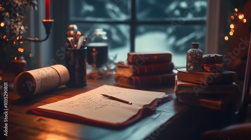 Cozy winter evening: writing desk with books, candlelight, and snowy window view