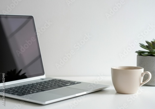 Cozy workspace with laptop, coffee and succulent plant, ideal for productive remote work or studying