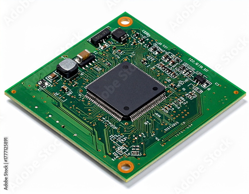 白い背景に置かれた電子回路基板とマイクロチップ。CPUや半導体など精密な電子部品を備えたテクノロジー・エンジニアリングの概念を表すクローズアップ写真