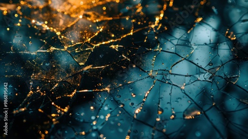 Cracked glass with reflections of the surrounding environment, emphasizing the break