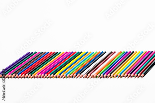 Craft and Creativity Ideas. Set of Various Colorful Pencils Placed Together in Row. Isolated Against White
