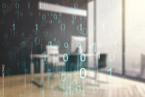 Creative abstract binary code hologram and modern desktop with pc on background, AI and machine learning concept. Multiexposure