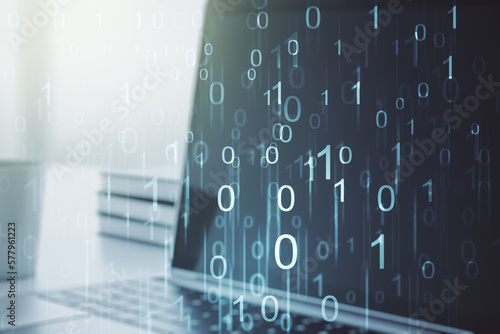 Creative abstract binary code hologram on modern computer background, AI and machine learning concept. Multiexposure