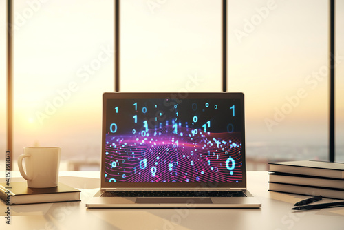 Creative abstract binary code hologram on modern computer monitor, AI and machine learning concept. 3D Rendering