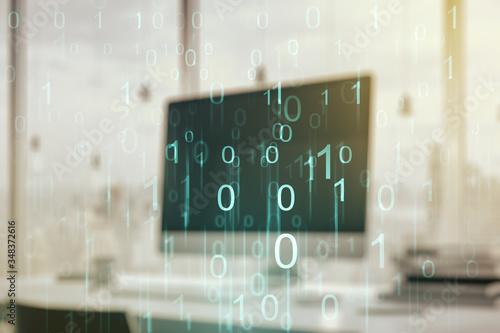 Creative abstract binary code sketch on modern laptop background, hacking and matrix concept. Multiexposure
