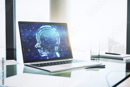 Creative artificial Intelligence concept with human head hologram on modern laptop screen. 3D Rendering