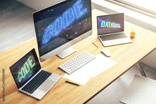 Creative Code word sign on modern computer monitor, international software development concept. 3D Rendering
