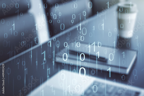Creative concept of binary code illustration on modern laptop background. Big data and coding concept. Multiexposure