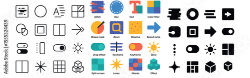 Creative effects icons set – flat, glitch and blur design symbols for projects