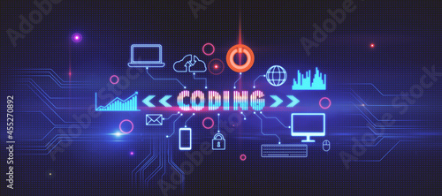 Creative glowing coding hologram on blue background. Information technology and business data concept. 3D Rendering.